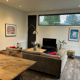 De ruime living kenmerkt zich door grote hoge raampartijen, die voor veel natuurlijk lichtinval en een prachtig uitzicht zorgt. In de living vindt u de loungehoek, de eethoek en de open keuken. De loungehoek is gezellig ingericht met een hoekbank, een salontafel en een tv-meubel met tv. De CAI-aansluiting zorgt ervoor dat tv-zenders kunnen worden ontvangen en WiFi is aanwezig.
