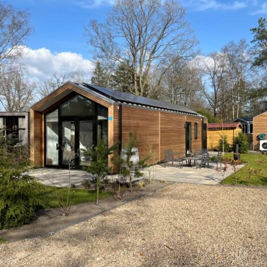 Forest Lodge 4 – Deze fraaie Forest Lodge heeft een sfeervolle living en je kunt via de openslaande deuren naar een aangenaam terras. De woning beschikt over een aparte keuken voorzien van luxe inbouwapparatuur. In de luxe betegelde badkamer vindt u een douchecabine, wastafel en designradiator. Er is een apart toilet. Deze Forest Lodge beschikt over 2 slaapkamers; de masterbedroom heeft een royale inbouwkast.