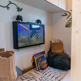 de La Mer (Kinder) 4 – Das Chalet de La Mer (Kinder) 4 ist ein ebenerdiges Chalet für 2 Erwachsene und 2 Kinder. Es ist speziell für Kinder gestaltet und bietet eine voll ausgestattete Kinderunterkunft mit vielen Beschäftigungsmöglichkeiten. Das Wohnzimmer verfügt über eine Sitzecke mit Fernseher, einen Essbereich und eine geräumige Küche. Das Kinderzimmer ist mit einem 1,60 m langen Etagenbett (geeignet für Kinder bis 8 Jahre) ausgestattet. Außerdem gibt es ein weiteres Schlafzimmer mit einem Doppelbett und ein Badezimmer mit Dusche, Waschbecken und WC. Ein Parkplatz steht zur Verfügung.