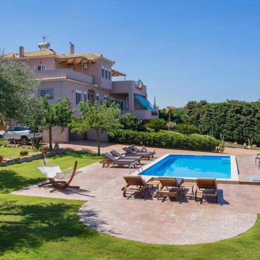 This lush villa in Kyparissia enjoys a commanding view of the sea and offers luxurious accommodation while being located close to amenities.