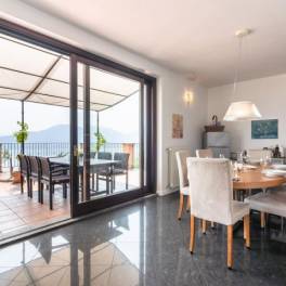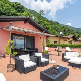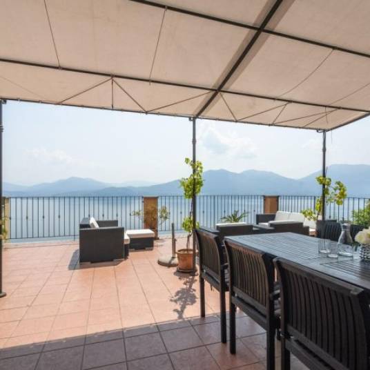 De attico is als volgt ongedeeld: een entree naar een groot terras van ca. 150mq, een lichte woonkamer met een keukenhoek en een zithoek. De woonkamer komt direct uit op een prachtig, ruim, gedeeltelijk overdekt terras met een ongeëvenaard uitzicht op het meer. De woonkamer leidt naar het slaapgedeelte met de hoofdslaapkamer, een badkamer en een tweede tweepersoonsslaapkamer, eveneens verbonden met het terras. Een eigen tuin completeert het achtergedeelte.