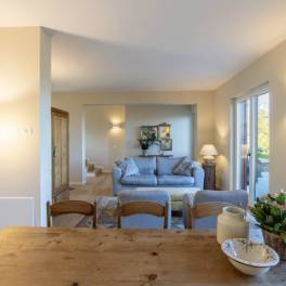Het huis is verdeeld over twee verdiepingen. De entree bevindt zich op de bovenverdieping, die vanuit de tuin bereikbaar is via een mooie trap. De hal, met een kleine garderobe, leidt naar de woonkamer, eetkamer en keuken. Alle kamers hebben toegang tot het terras.