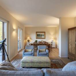 Op de benedenverdieping, zowel intern bereikbaar via een comfortabele houten trap als extern via een aparte ingang, bevindt zich een grote kelderruimte met een open haard en een bar met een kleine wijnkelder. Deze ruimte zou kunnen worden omgebouwd tot een mooie tv-kamer. De kelderruimte leidt naar een klein, zelfstandig appartement met een zitkamer, slaapkamer en badkamer. Op deze verdieping bevindt zich ook de garage.