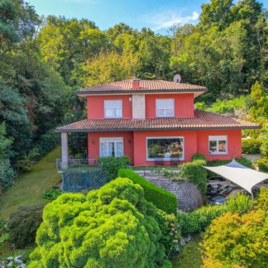 Te koop in de populaire badplaats Ranco, een prachtige villa gelegen in een rustige omgeving, op slechts enkele stappen van de oevers van het Lago Maggiore. De woning biedt een adembenemend uitzicht over zowel het meer als de imposante omliggende bergen.