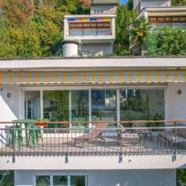 Het appartement, met een totale oppervlakte van ongeveer 90 vierkante meter, is verdeeld over twee verdiepingen en is als volgt ingedeeld: de ingang komt uit op een hal met op maat gemaakte kasten voor jassen, gevolgd door de open woonkamer, die bestaat uit een eetkamer, een open keuken, compleet met apparatuur en wasmachine, en een woonkamer met open haard. De eetkamer geeft toegang tot een overdekt terras met een gemetselde barbecue en directe toegang tot de tuin. De woonkamer biedt een prachtig uitzicht op het meer en heeft via grote schuiframen toegang tot een balkon met een zithoek en een zonnescherm.