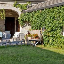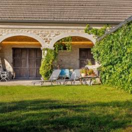 De natuursteen, de absolute hoofdrolspeler van de gevel, verwarmd door de ochtendzon en zacht bij zonsondergang, vertelt een verhaal van stevigheid, intimiteit en authenticiteit. Elk detail roept het idee op van een huis dat gemaakt is om langzaam te worden beleefd, genietend van het eenvoudige ritme van het platteland.