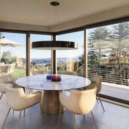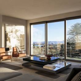 De eerste verdieping is volledig gewijd aan de leefruimte, opgevat als een grote open ruimte met woonkamer, eetkamer en keuken, allen voorzien van grote schuifpuien met uitzicht op het meer. Deze zorgen voor een uitzonderlijke lichtinval en een natuurlijke verbinding met de buitenruimtes. Verder omvat deze verdieping een gastentoilet, de master bedroom met en-suite badkamer en inloopkast, evenals twee extra slaapkamers.