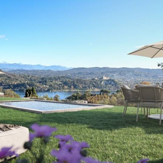 Op een dominante heuvelachtige ligging, op slechts enkele minuten van Arona en Meina, midden in de rust en het groen van Dagnente, bieden wij een nieuw gebouwde villa te koop aan met een buitengewoon panoramisch uitzicht op het Lago Maggiore. Een exclusieve en sfeervolle omgeving, ideaal voor wie op zoek is naar een prestigieuze woning, omgeven door natuur.