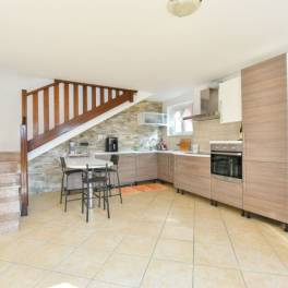 Op de begane grond bevindt zich een ruime leefruimte met open keuken, een badkamer met douche en een tweede leefruimte die dankzij de royale afmetingen en het open uitzicht eenvoudig kan worden omgevormd tot een slaapkamer. De veranda, direct toegankelijk vanuit zowel de keuken als de woonkamer, is ideaal om buiten te eten en te genieten van de stilte van de omgeving.