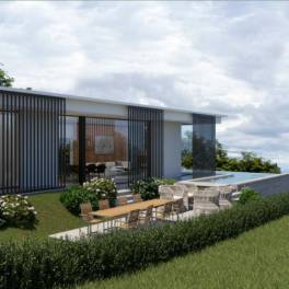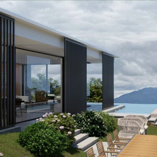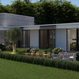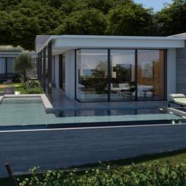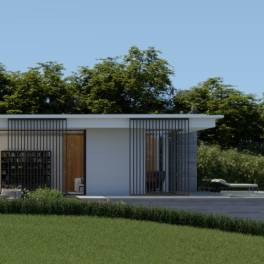 Het architectonisch ontwerp van de villa hanteert een moderne en strakke vormen, gekenmerkt door eenvoudige volumes en grote raampartijen die het natuurlijke licht overvloedig binnenlaten.