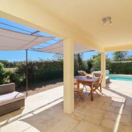 Leuk overdekt terras van 30 m² met zithoek en eethoek.