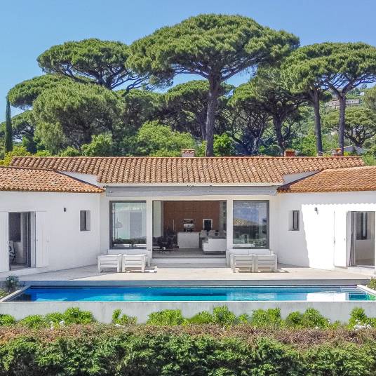 Op een werkelijk uitzonderlijke locatie in Grimaud, op slechts enkele meters van strand en zee en volledig uit het zicht gelegen, bevindt zich deze schitterende eigentijdse villa met panoramisch zeezicht over de kust van Saint-Tropez. Een zeldzame combinatie van privacy, luxe en een onovertroffen ligging, waar u geniet van rust, ruimte en een adembenemend uitzicht over zee, heuvels en het pittoreske dorp.