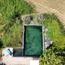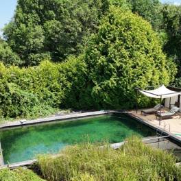 Indeling hoofdwoning met op de begane grond een hal, volledig uitgeruste keuken met een houtkachel, leefdeel (in totaal 60 m²) met eetkamer en woonkamer met een houtkachel. Grote openslaande deuren geven toegang tot een terras met vrij uitzicht op het terrein en het natuurzwembad.