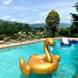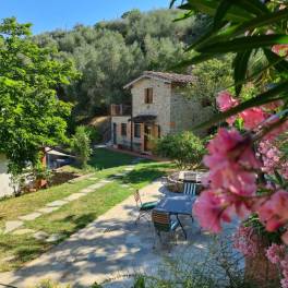 2) Prachtig gerenoveerd stenen bijgebouw bestaande uit een woonkamer met kitchenette op de begane grond; op de eerste verdieping slaapkamer met badkamer, evenals een groot terras met panoramische uitzicht op de groene heuvels en het zwembad en een garage met veranda.