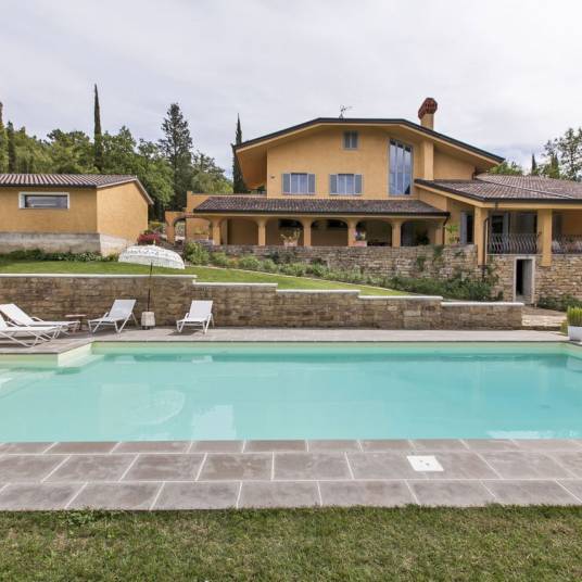 Prestigieuze moderne villa te koop op enkele kilometers van Arezzo, vlakbij een klein stadje met alle voorzieningen.