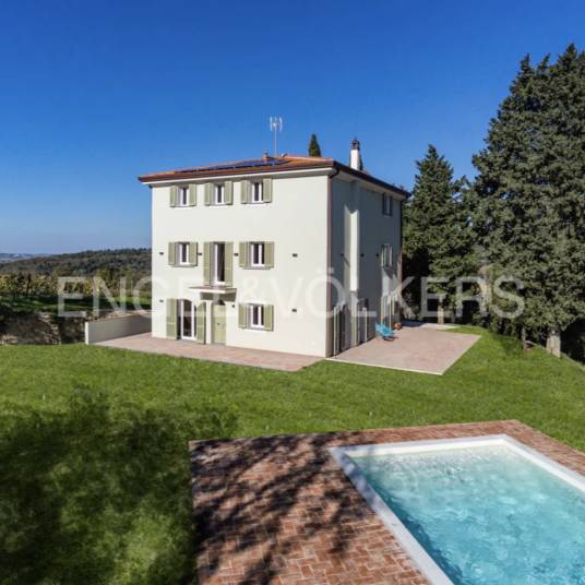 Elegant retreat in the heart of Tuscany: tradition, design and sustainability | This completely renovated country house stands on the rolling Tuscan hills, close to the charming village of Ghizzano and to the renowned Castelfalfi Golf Club. Here, Tuscan architecture, modern living comfort and ecological sustainability blend together to create a retreat with exceptional character, ideal as a private residence or elegant holiday home. An exclusive retreat renovated with great attention to environmental sustainability. The A4 energy class certificate guarantees high self-sufficiency, thanks to photovoltaic panels that minimise ecological impact. From the bright windows, every view is picture-perfect, and the panoramic swimming pool with solarium offers moments of pure relaxation. Surrounded by the renowned organic vineyards of the Ghizzano Estate, this place is a unique combination of past and present: ideal for relaxation and regeneration, but at the same time open and cosmopolitan thanks to its proximity to cities of art such as Lucca, Volterra, San Gimignano, Pisa and Florence. The property consists of two independent units, designed to offer maximum privacy and flexibility: The main house (approximately 240 m²) consists of the ground floor with a large kitchen with direct access to the garden, two living rooms and a study area. On the first floor there are three bedrooms, each with a private bathroom. Guest rooms (approximately 112 m²) on the second floor, with independent access via an external staircase. There are 4 bright bedrooms, each with a private bathroom and views of the beautiful surrounding landscape. Each room is furnished to a high standard, with fine materials, natural colours and great attention to detail. In total, the farmhouse has 7 bedrooms with private bathrooms and has been renovated to the highest standards of quality and aesthetics. The architecture reflects the tradition of classic Florentine country houses, with handmade terracotta floors, custom-made wooden windows and elegant oak flooring. At the same time, the house offers state-of-the-art technology and high energy efficiency in Class A4: photovoltaic systems, solar panels, underfloor heating, air conditioning and an electric charging station. All this makes it the ideal solution both as a residence and for those who wish to start an exclusive tourist business. In fact, the layout of the spaces, the timeless elegance and the proximity to services and main attractions also make it perfect for tourist rentals. An ideal place that combines the pleasure of country life with proximity to services and the famous art cities of Tuscany.