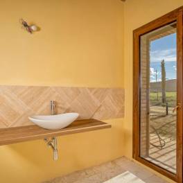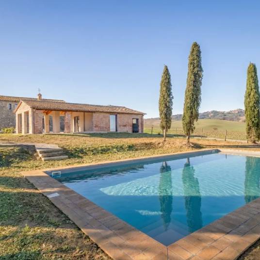 Splendid property to be finished to your taste | This splendid property, born from the renovation of an old country house, is immersed in the pristine countryside of the Val d’Orcia nature reserve, a UNESCO World Heritage site. It is located a few kilometers from the renowned Roman baths of Bagno Vignoni and the charming village of San Quirico d’Orcia. It is reached after a short stretch of a dirt road, crossing the wheat fields that have made this area famous, and a wrought-iron electric gate leads to the property. The fully fenced garden is surrounded by typical Tuscan cypress trees and flowerbeds that separate the farmhouse from the annex and the pool. The house is structured on two levels: the first floor features a large living area with traditional vaulted ceilings, a utility room, a spacious bedroom, and a large bathroom. The upper floor, accessible both by an internal staircase and a picturesque external stone staircase, is designed in keeping with rural tradition. At the center is a cozy living room with a fireplace, while in the four corners are four bedrooms, all with en suite bathrooms. The swimming pool and the annex opposite the pool are still under construction. The farmhouse will be delivered turnkey, offering the potential buyer the unique opportunity to work directly with the builder to define and customize the final details and finishes.