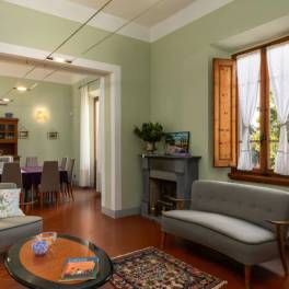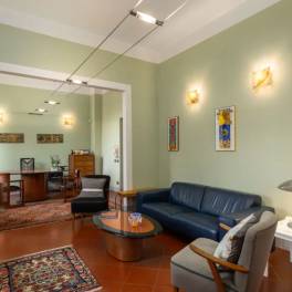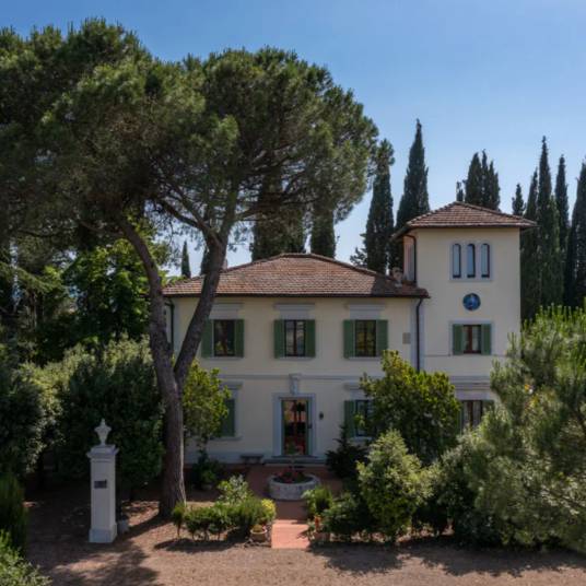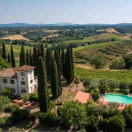 Villa with pool overlooking San Gimignano | The Villa is in Art Nouveau style, dates back to the mid-19th century and is located on a hill overlooking the Tuscan countryside. It is the highest point in the municipality of Poggibonsi so it allows a 360 ° view of the Chianti Senese and the Towers of San Gimignano. The Villa has a large living room with fireplace on the ground floor and a dining area with access to the garden. Furthermore, also on the ground floor there are three double bedrooms, each with an en suite bathroom. On the first floor overlooking the vineyards and olive groves, there are five other bedrooms, each with en suite bathroom, and a study. Beautiful terrace with spectacular views of the towers of San Gimignano and the vineyards of the Sienese Chianti. The turret of the Villa has the ninth bedroom, always with en suite bathroom, and a spectacular 360 ° view. The Villa is equipped with air conditioning and offers a large garden with swimming pool and olive grove. The basement is equipped with technical rooms, a cellar and a garage. Outside the latter, there is a BBQ fireplace and a wood-burning oven for pizza.