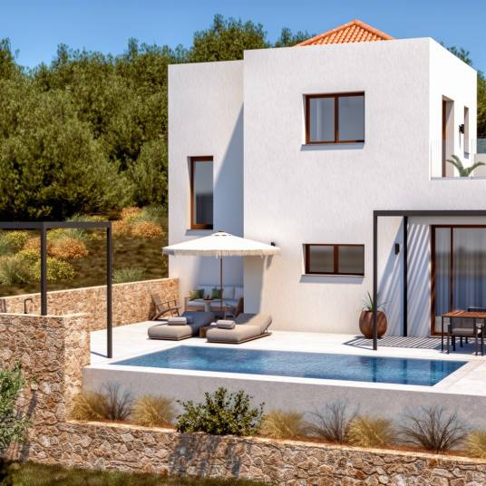 Omringd door weelderig groen van de olijfgaarden en met adembenemende uitzichten over de Egeïsche Zee en haar eilanden. Elke villa is zorgvuldig gepositioneerd op de heuvel om privacy en de schoonheid van de omgeving te omarmen. Het project ligt naast een natuurgebied waardoor het onaangetast zal blijven.