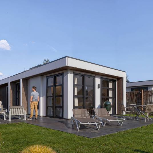 Villa Hoflee wordt standaard geleverd als 4-persoons woning met twee ruime slaapkamers, beide voorzien van inbouwkasten en tv-aansluiting. De stijlvolle badkamer is uitgerust met een wastafel en een royale inloop-regendouche. Daarnaast is er een apart toilet. Vanuit de woonkamer stapt u zo uw eigen tuin in, waar optioneel een bijgebouw (10 m²) of een berging geplaatst kan worden.