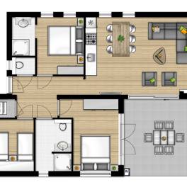 Er zijn 3 slaapkamers waarvan 2 met een tweepersoonsbed en 1 met 2 eenpersoonsbedden. Er zijn 2 badkamers, waarvan 1 en suite en 1 met een toilet. Beide hebben een regendouche. Ook is er een separaat gastentoilet aanwezig en een kleine, inpandige berging.