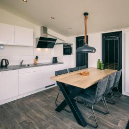 Wat opvalt is de ruime, strak vormgegeven open keuken welke is voorzien van alle gemakken, waaronder een vaatwasser en combi-magnetron/oven.