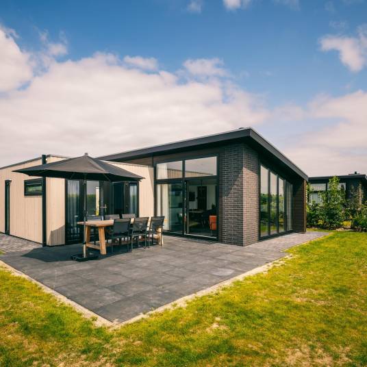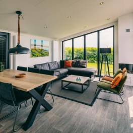Aangeboden deze prachtige 6-persoons, strak vormgegeven woning inclusief volledig eigendomskavel van ruim 428m2!